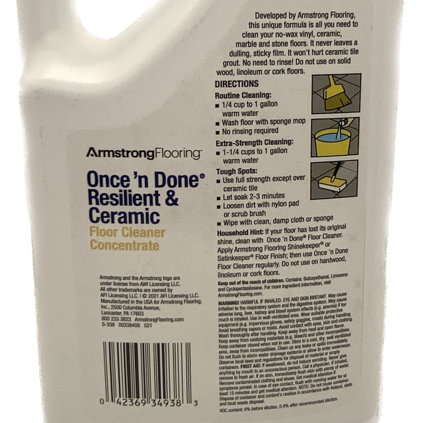 Ideal for routine cleaning, extra-strength cleaning and eradicating tough spots and stains, Armstrong Once 'n Done No-Rinse Floor Cleaner Concentrate, 64-ounce (S-338) helps you clean your vinyl and ceramic flooring safely and thoroughly. Armstrong ceramic floor tile cleaner and vinyl cleaner leaves zero dulling or sticky film and requires no rinsing, offering a quick cleaning solution that will restore your floors to their best state. This product can be used on grouted or ungrouted Armstrong vinyl and ceramic floors, including sheet vinyl, vinyl tile and luxury vinyl tile (LVT) floors. It should not be used on linoleum, hardwood or cork floors.