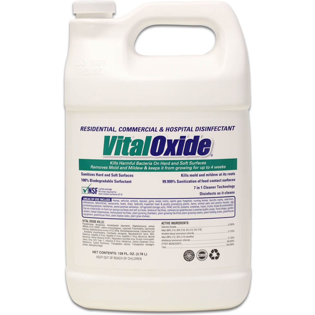 Vital Oxide Disinfectant Cleaner is an EPA Certified hospital-grade disinfectant with a mild scent for eliminating many types of bacteria & viral strains including COVID-19. Eliminates & prevents mildew on carpet, upholstery, hard surface floors and most other interior surfaces at home, in healthcare, education facilities and more.