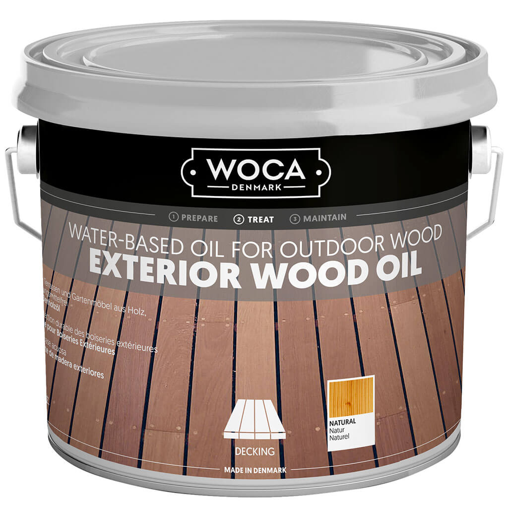 Exterior Natural Wood Oil by Woca provides a hard-wearing surface on new and previously oiled outdoor wood surfaces. Use for initial coating or ongoing maintenance of wooden decks, patio furniture, cladding and other exterior wood surfaces. Woca Exterior Wood Oil, Natural, 2.5L is water based, contains UV protection, resists mildew and is for use on traditional and exotic wood species. Natural Woca Exterior Wood Oil enhances the natural color and graining of hardwood but does not add pigment to old wood surfaces that have lost their pigment. Full cure in 24-48 hours dependent upon ambient temperature and humidity.